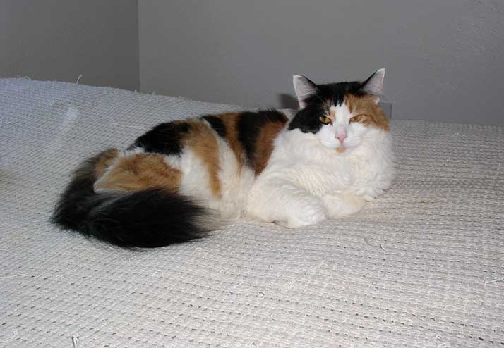 Nauseatingly cute as a kitten, Calypso grew up to be a very pretty long-haired calico. She's quite large for a girl and before we changed the way we feed our cats, she'd been starting to get a bit hefty. With the diet change she went from 15 pounds, 9 ounces (7.0 kg) to 13 pounds, 14 ounces (6.2 kg), which is a good weight for her. She's not a big eater, but is on the lazy side. |