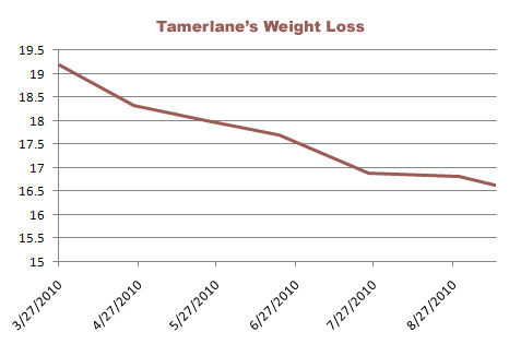 First of all, he lost weight! We'd like to see him get past his current plateau and reach 16 pounds even but we're thrilled that he's gone from 19 pounds, 3 ounces to 16 pounds, 10 ounces. I wish I'd taken a "before" picture of his first weigh-in. |
